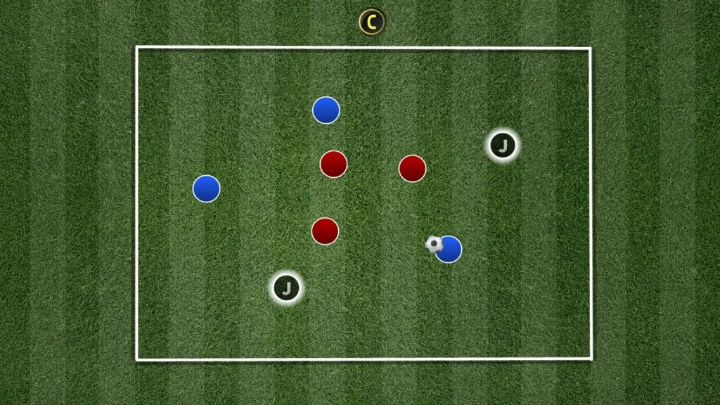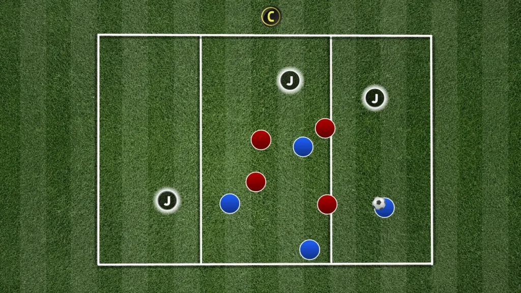 สร้างสี่เหลี่ยมผืนผ้าขนาด 20×15 เมตร โดยมีจุดยืนเป็นกลาง (ตัวตลก) สองจุดรองรับทีมที่ครองบอล ฝ่ายรุกทั้งสามพยายามรักษาบอลไว้ไม่ให้ฝ่ายรับทั้งสามคนทำพลาด