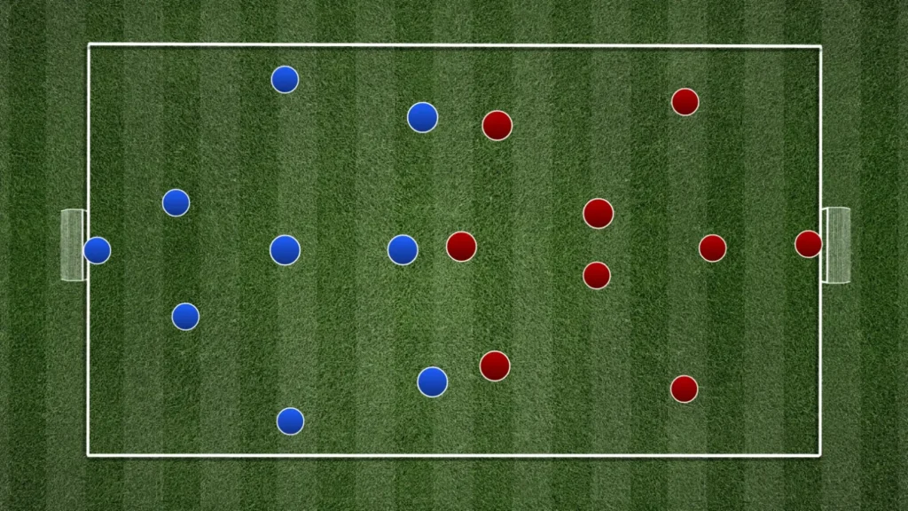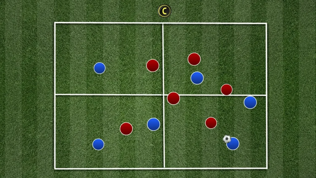 แบ่งตารางขนาด 30×25 เมตร ออกเป็นสามช่องแนวตั้ง ฝ่ายรุกสี่คนจะเล่นกับฝ่ายรับสี่คน โดยมีผู้เล่นลอยตัวสามคนคอยสนับสนุนทีมในการครองบอล
