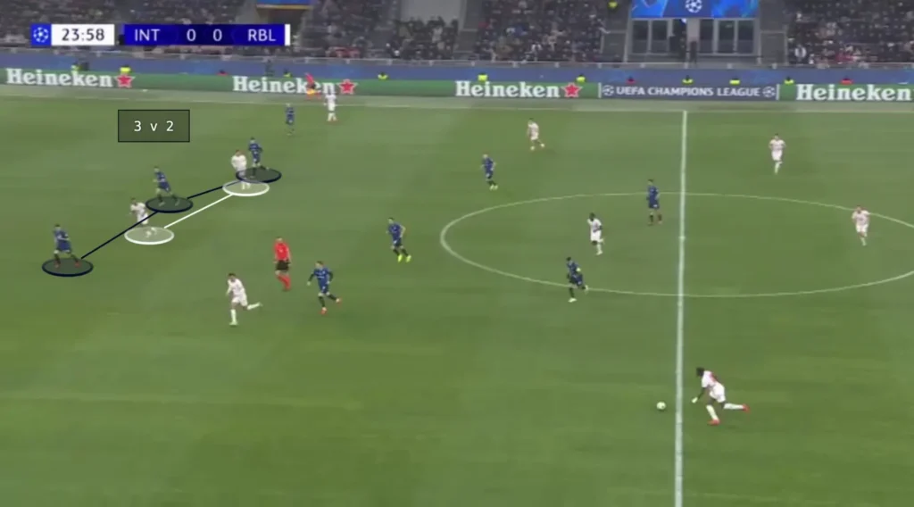 แมนเชสเตอร์ ซิตี้ ของเป๊ป กวาร์ดิโอล่า ขึ้นชื่อในเรื่องความสามารถในการสร้างความได้เปรียบในพื้นที่ตรงกลาง ด้วยการใช้ฟูลแบ็คแบบสลับตัวแมนเชสเตอร์ ซิตี้จึงมักได้เปรียบแบบ 5 ต่อ 3 ในแดนกลาง ทำให้พวกเขาครองบอลได้เหนือกว่าและควบคุมจังหวะของเกมได้ ความสามารถในการเปลี่ยนความได้เปรียบนี้ไปยังพื้นที่สุดท้ายทำให้พวกเขากลายเป็นหนึ่งในทีมรุกที่ทรงพลังที่สุดในยุโรป