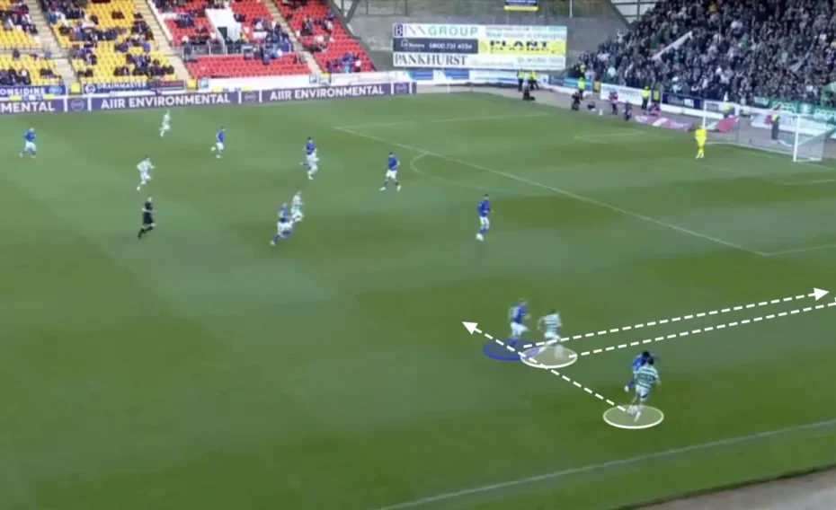 เมื่อกองหลังตัวกลางขยับขึ้นมาด้านข้าง พวกเขาสามารถพาบอลไปข้างหน้าเมื่อรับบอลได้ เพื่อทะลวงแนวรับแรกของฝ่ายตรงข้าม นี่เป็นวิธีที่ปลอดภัยและง่ายสำหรับเซลติกในการทะลวงแนวรับแรกของฝ่ายตรงข้ามและส่งบอลขึ้นไปข้างหน้า